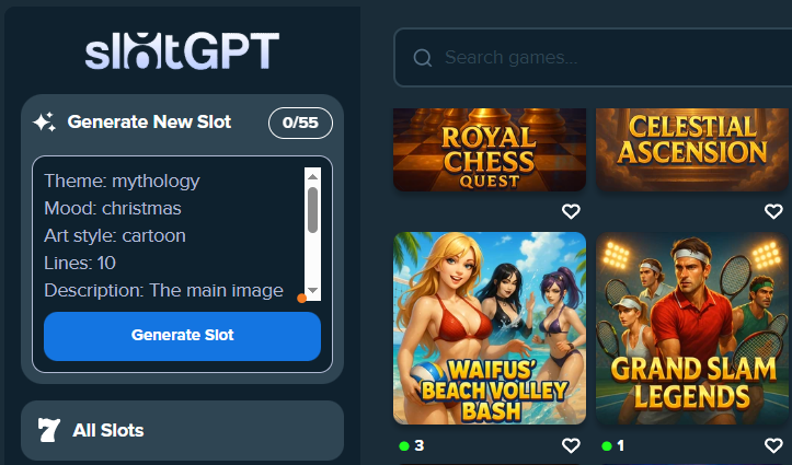 SlotGPT is the world's first slot machine generator that allows users, players, and operators to create exciting and unique slot machines using simple voice and text prompts. No complicated settings or programming or design skills are required. All you need is a detailed prompt describing the slot.